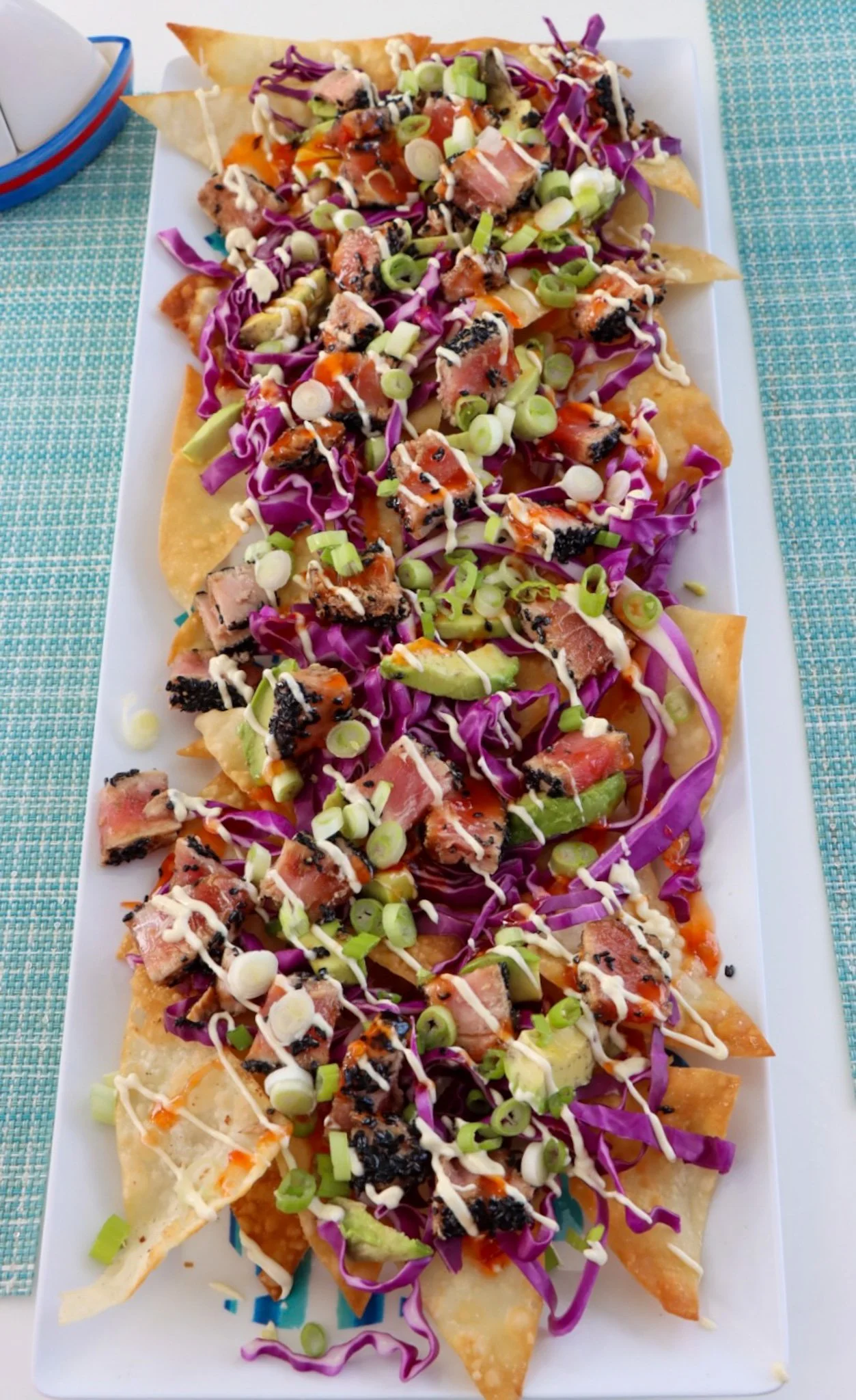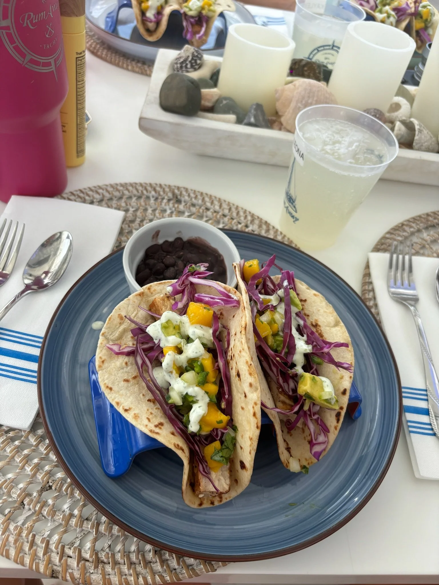 Sample Lunch Menu AHI TUNA NACHOS Fried wonton chips with Pan Seared Ahi, Avocado, Red Cabbage, Scallions and Jalapeño Slices FRESH MAHI TACOS with Mango Avocado Salsa, Cilantro Crema and Chef Tara’s Famous Black Beans CHARRED LEMON CAESAR SALAD WITH ROASTED SHRIMP and Boat Made Croutons SMASH BURGER on Sourdough Bun with Cheddar Cheese and Homemade Pickles and Grilled Onions with Rosemary Potatoes HONEY HARISSA CHICKEN BOWLS with Fresh Pita Bread, Roasted Red Pepper Hummus and Tzatziki LEMON FETA ORZO SHRIMP SALAD with Cucumbers, Tomatoes, and Chickpeas